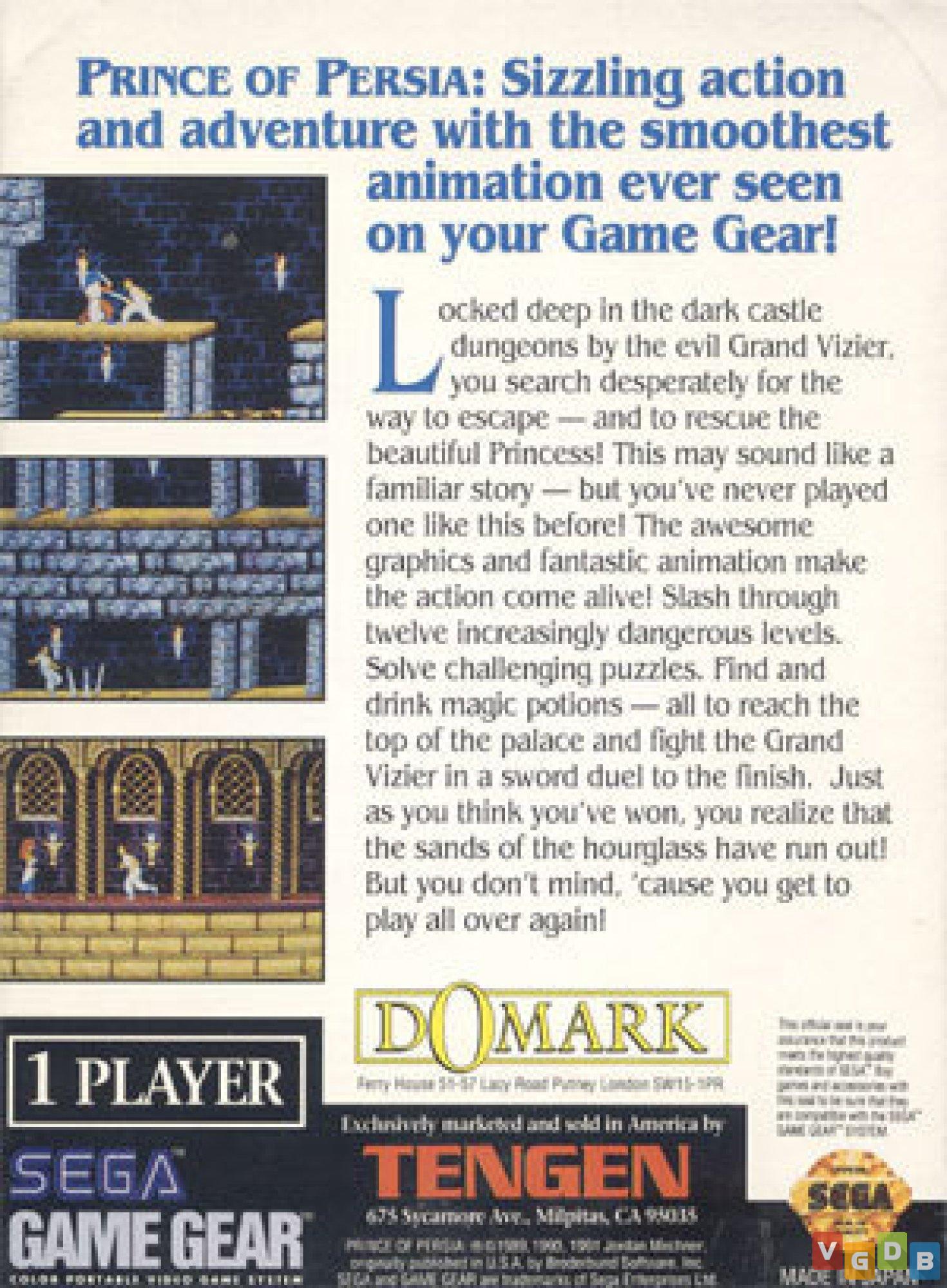 Jogo de ação 2D em plataforma com elementos de adventure, desenvolvido e publicado pela Domark. Além do Game Gear, o game também foi lançado para 3DS, Game Boy, Game Boy Color, Master System, Mega Drive, NES, Sega CD, Super Nintendo, Turbografx-CD, Wii e nos microcomputadores Amiga, Amstrad CPC, Apple II, Atari ST, FM Towns, Macintosh, PC, PC-98 e X68000, bem como nas coletâneas Prince of Persia CD Collection (PC) e Prince of Persia Collection (PC).