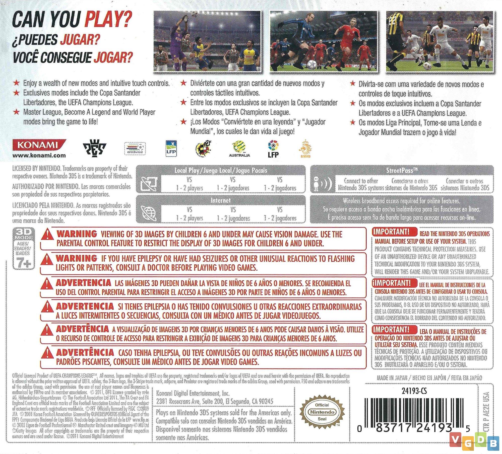 Jogo de esporte 3D (futebol), estilo simulação, desenvolvido e publicado pela Konami. Além do 3DS, o game também foi lançado para PlayStation 2, PlayStation 3, PSP, Wii, Xbox 360, dispositivos móveis e PC.