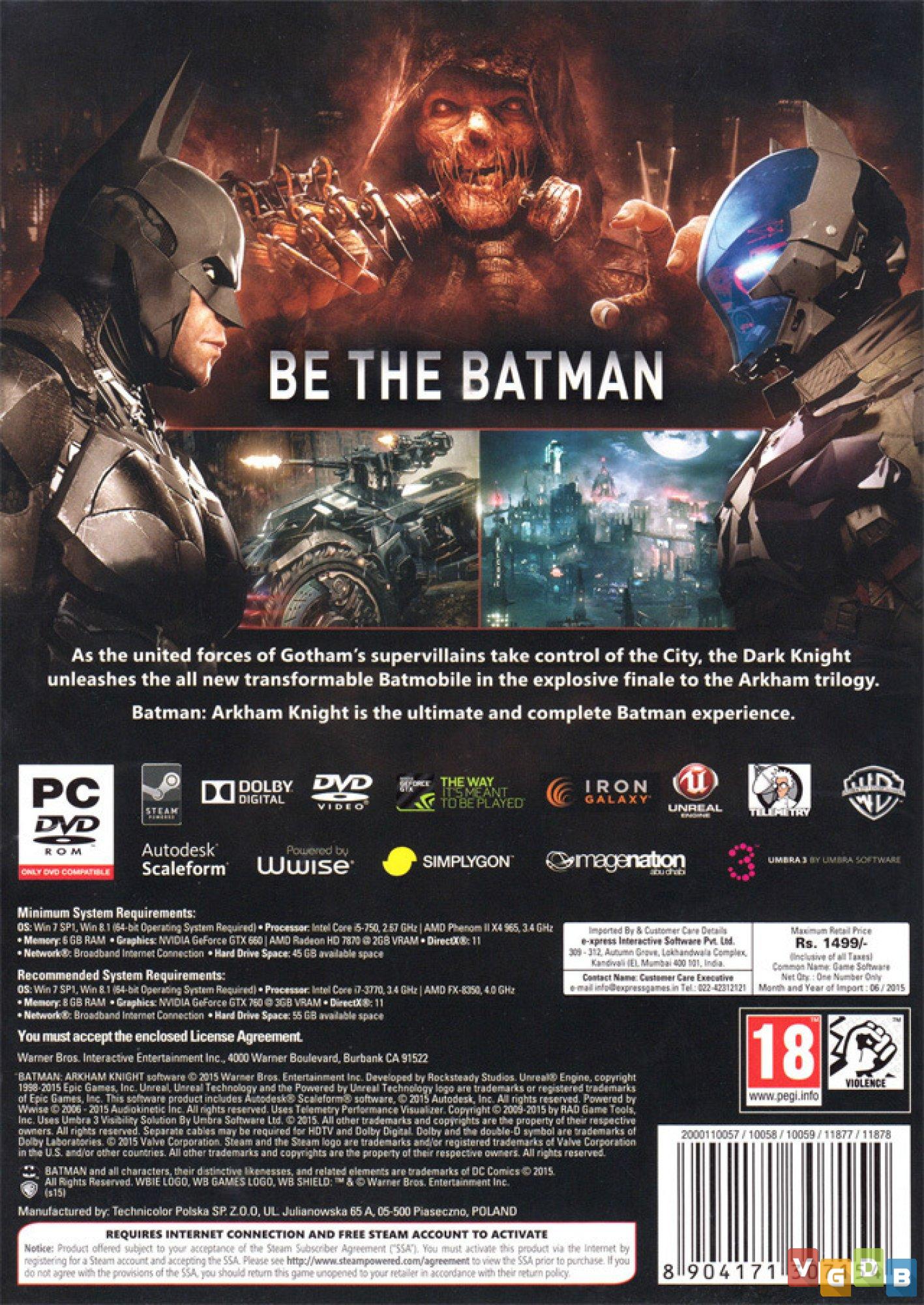Jogo de ação 3D em mundo aberto, desenvolvido pela Rocksteady Studios e Iron Galaxy Studios, publicado pela Warner Bros. Interactive Entertainment. Além do PC, o game também foi lançado para PlayStation 4, Switch e Xbox One, além da versão Game of the Year (PlayStation 4 / Xbox One) e nas coletâneas Batman: Arkham Trilogy (Switch) e Batman: Arkham Collection (PlayStation 4 / Xbox One).