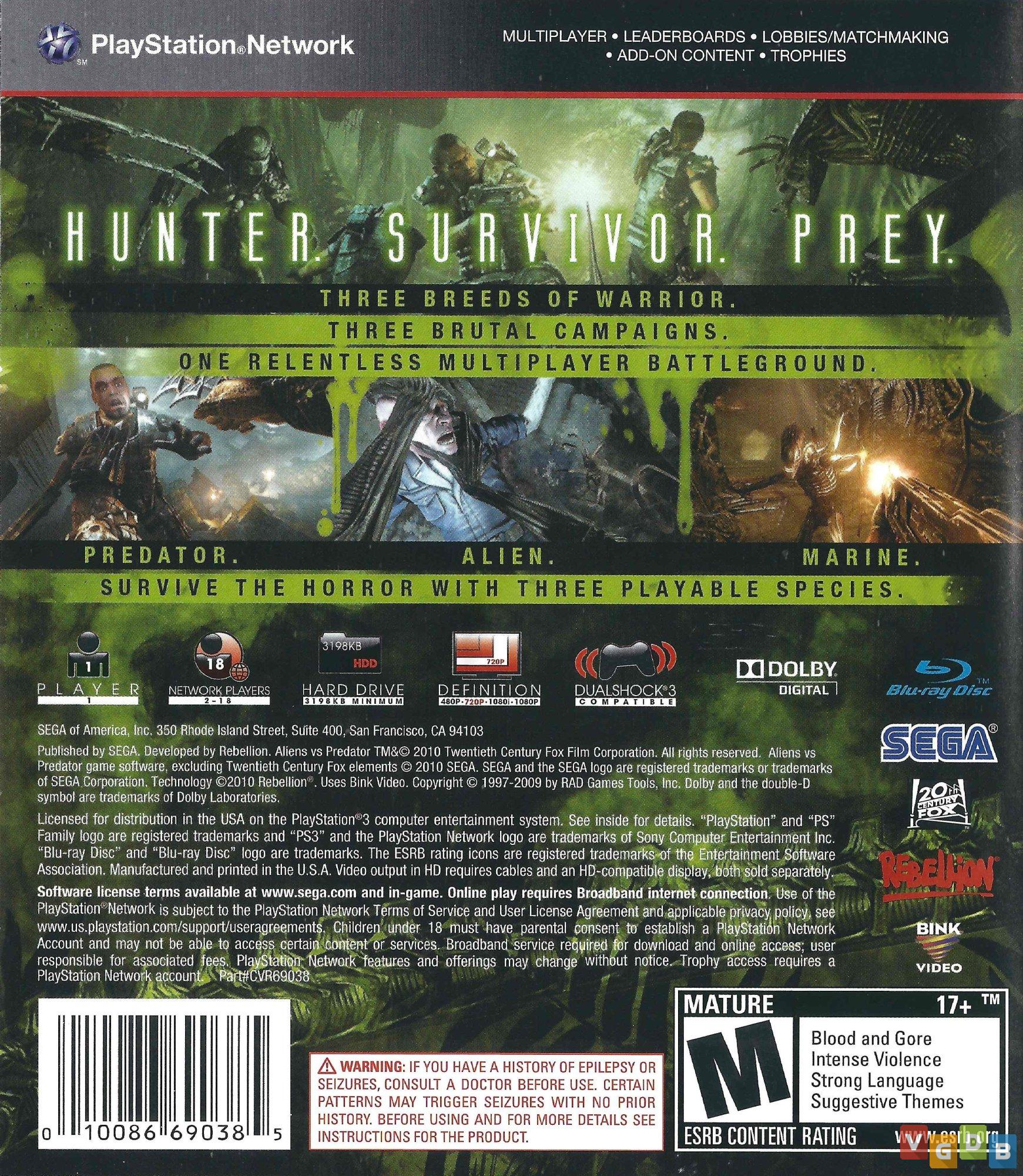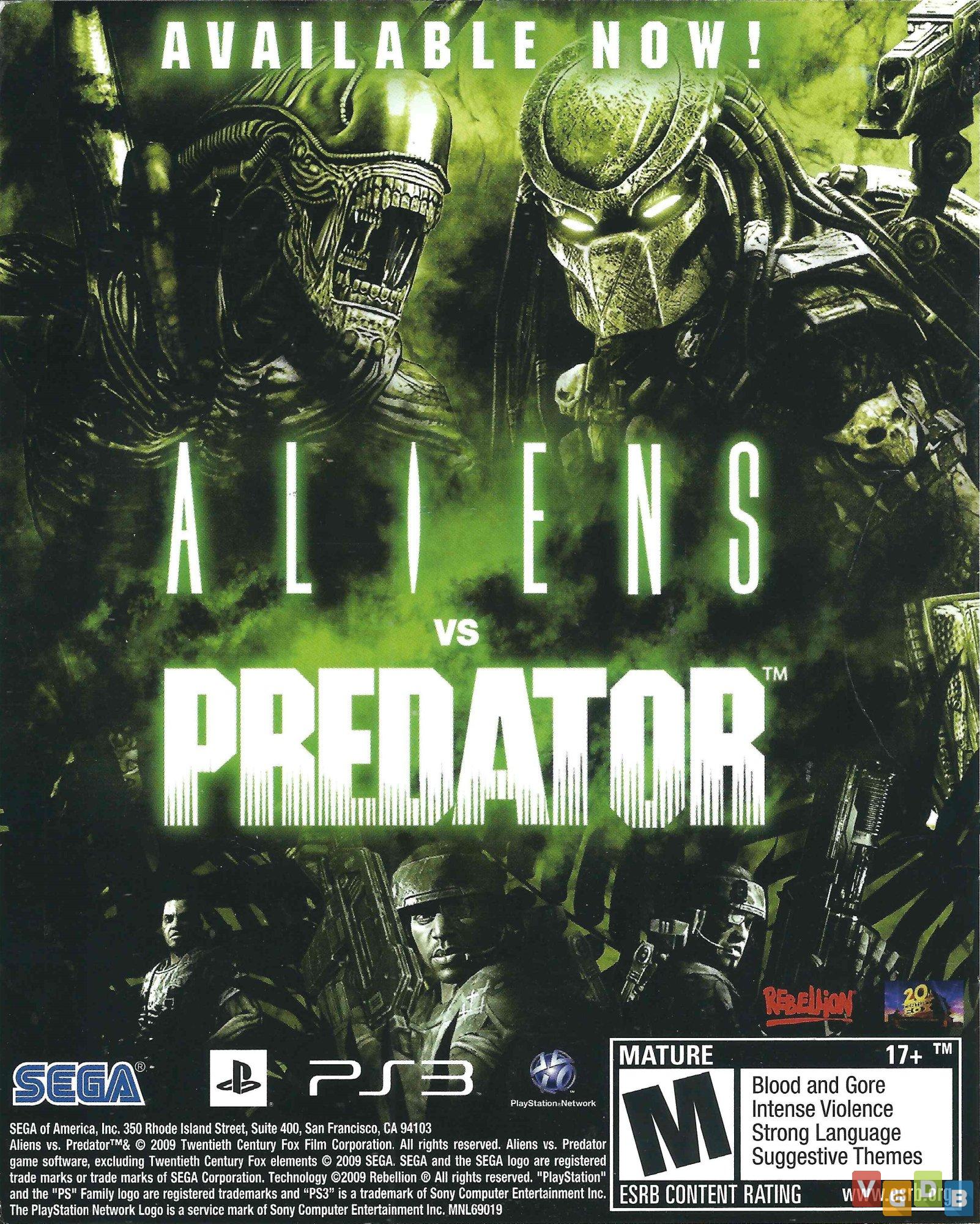 Desenvolvido pela Rebellion e lançado pela SEGA em 2010 para PlayStation 3, Xbox 360 e PC, Aliens Vs. Predator é um reboot do clássico game de tiro em primeira pessoa original desenvolvido também pela Rebellion para PC’s em 1999. Assim como no original, você pode escolher jogar com o Alien, com o Predador ou com o fuzileiro colonial, cada um com sua história, missão e características próprias.