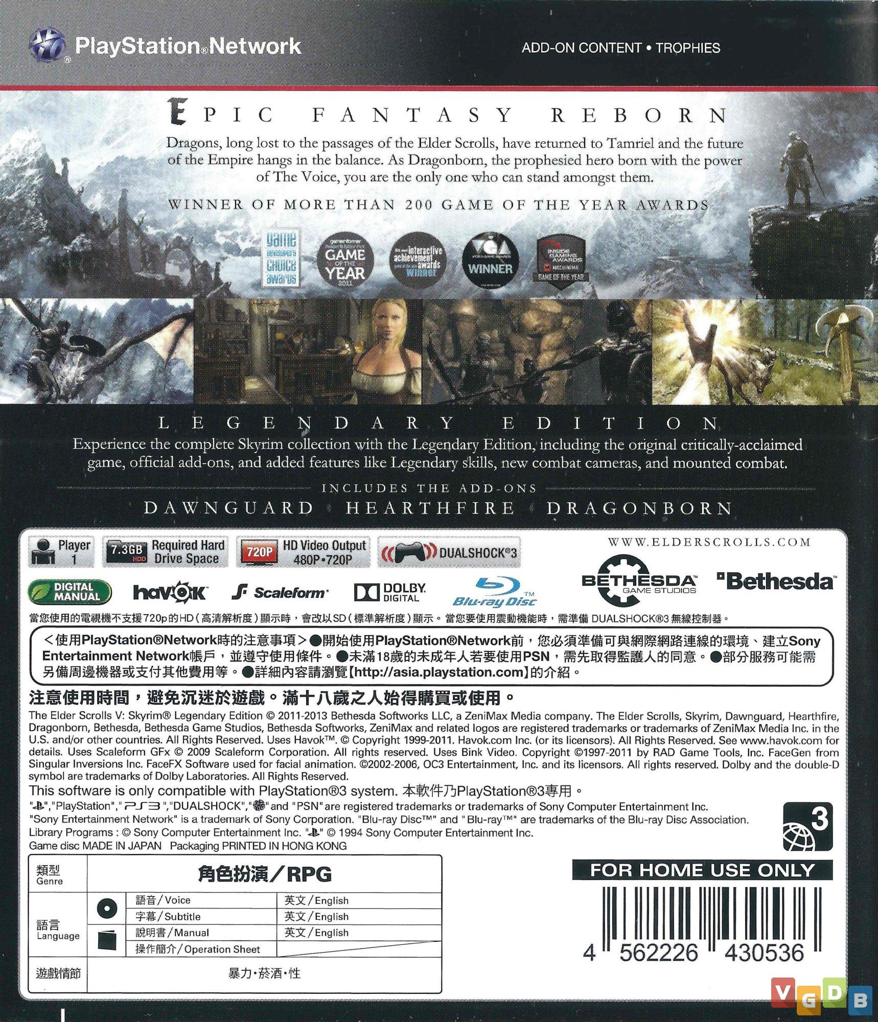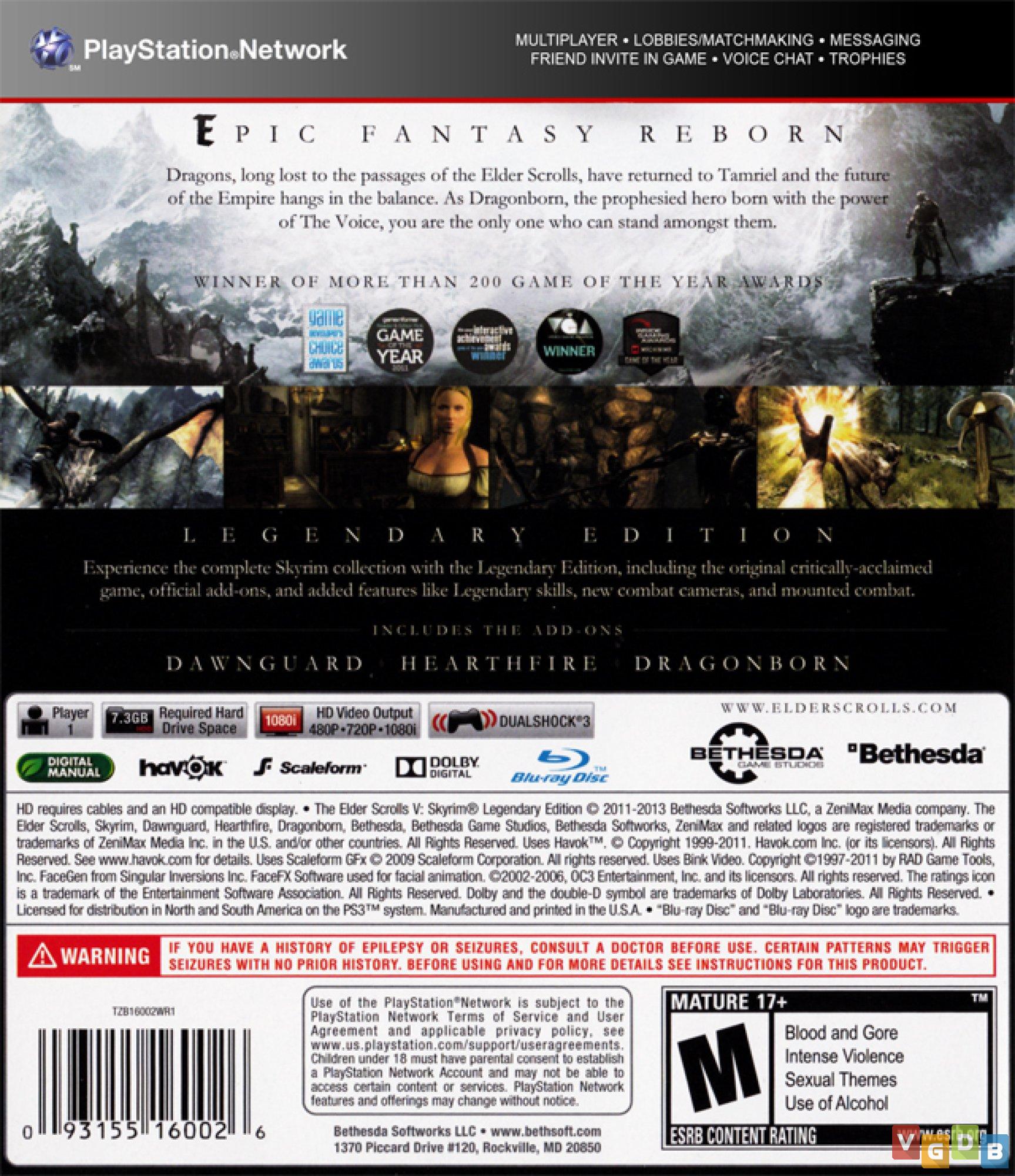 Jogo de RPG de ação 3D, desenvolvido pela Bethesda Game Studios e publicado pela Bethesda Softworks. Além do PlayStation 3, o game também foi lançado para Xbox 360 e PC, bem como na coletânea The Elder Scrolls V: Skyrim / BioShock Infinite (PlayStation 3 / Xbox 360). Uma versão remasterizada e completa foi lançada para PlayStation 4, PlayStation 5, Switch, Xbox One e PC, além de uma versão em realidade virtual para PlayStation VR.