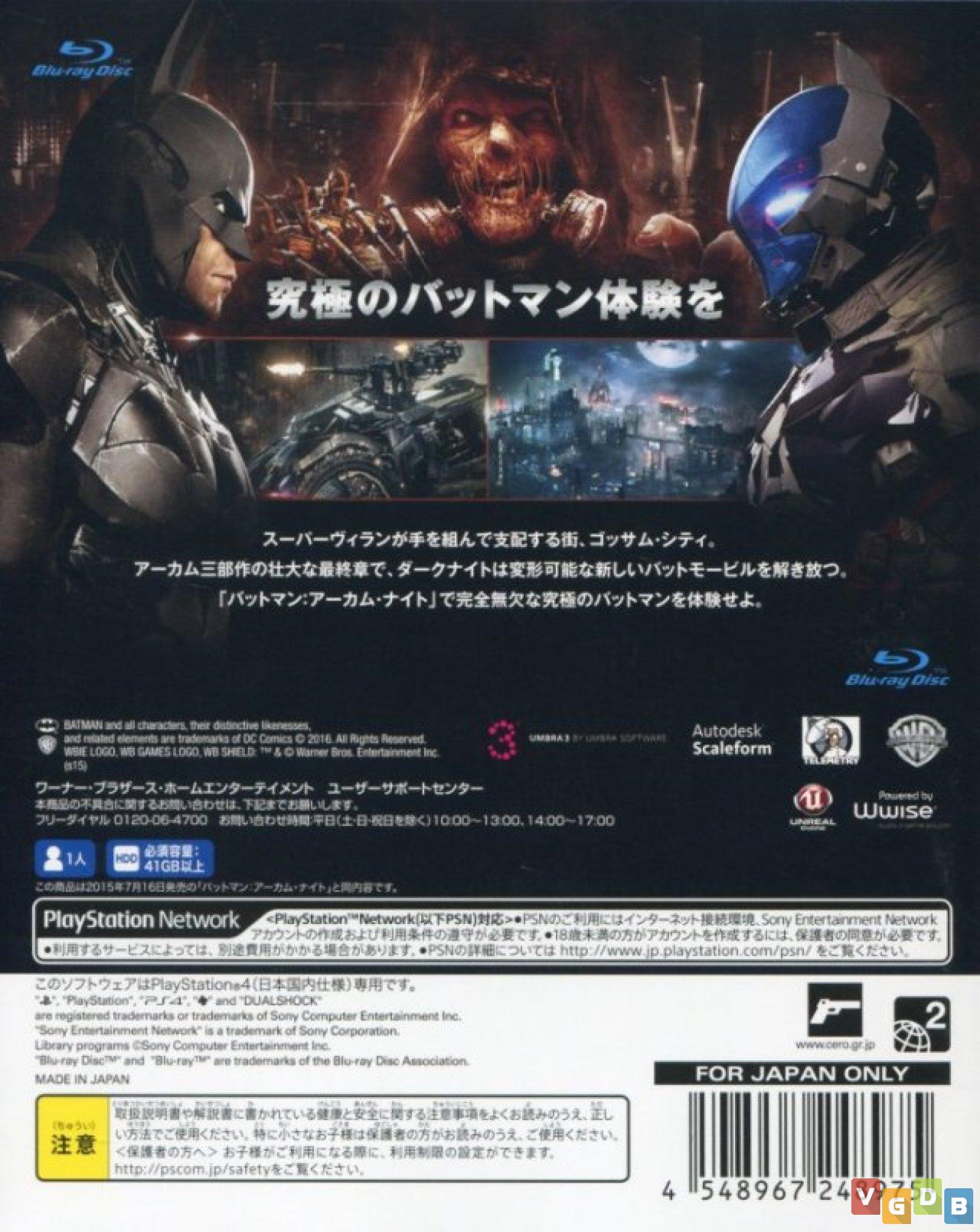 Jogo de ação 3D em mundo aberto, desenvolvido pela Rocksteady Studios e publicado pela Warner Bros. Interactive Entertainment. Além do PlayStation 4, o game também foi lançado para Switch, Xbox One e PC, além da versão Game of the Year (PlayStation 4 / Xbox One) e nas coletâneas Batman: Arkham Trilogy (Switch) e Batman: Arkham Collection (PlayStation 4 / Xbox One).