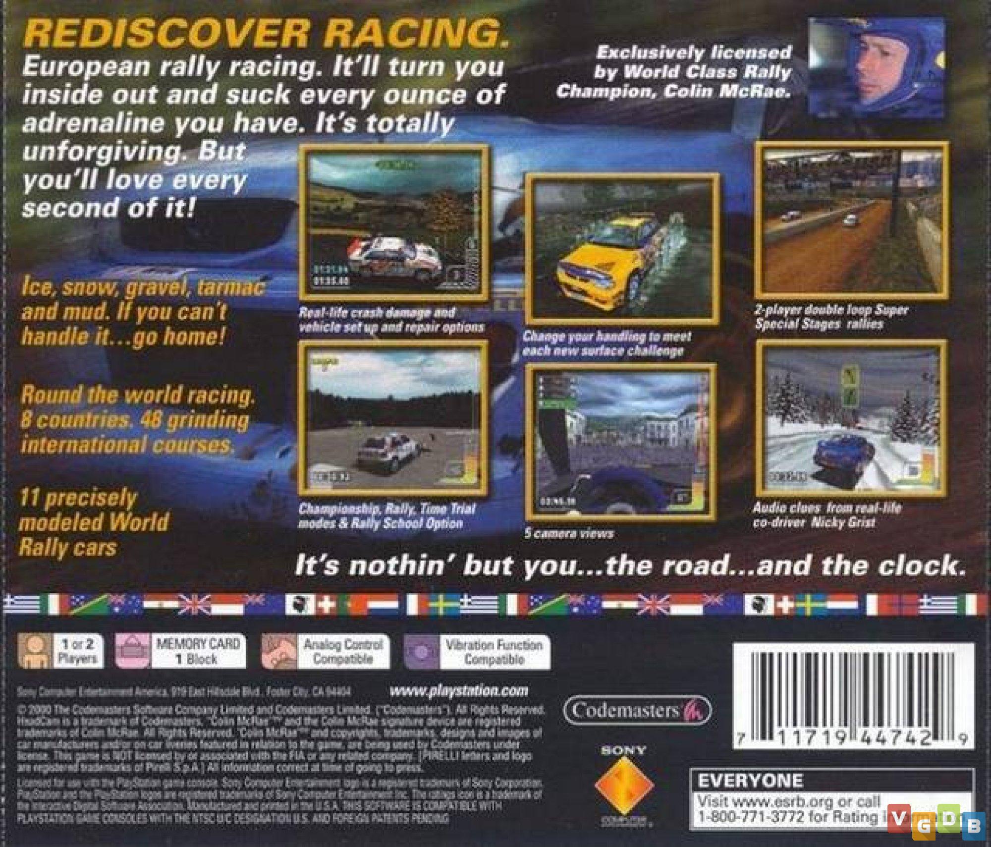 Jogo de corrida de veículos 3D (rali), desenvolvido e publicado pela Codemasters (Europa), publicado também pela Spike (Japão) e Sony (Estados Unidos). Além do PlayStation, o game também foi lançado para Game Boy Color, dispositivos móveis e PC, bem como na coletânea TOCA World Touring Car / Colin McRae Rally (PlayStation).