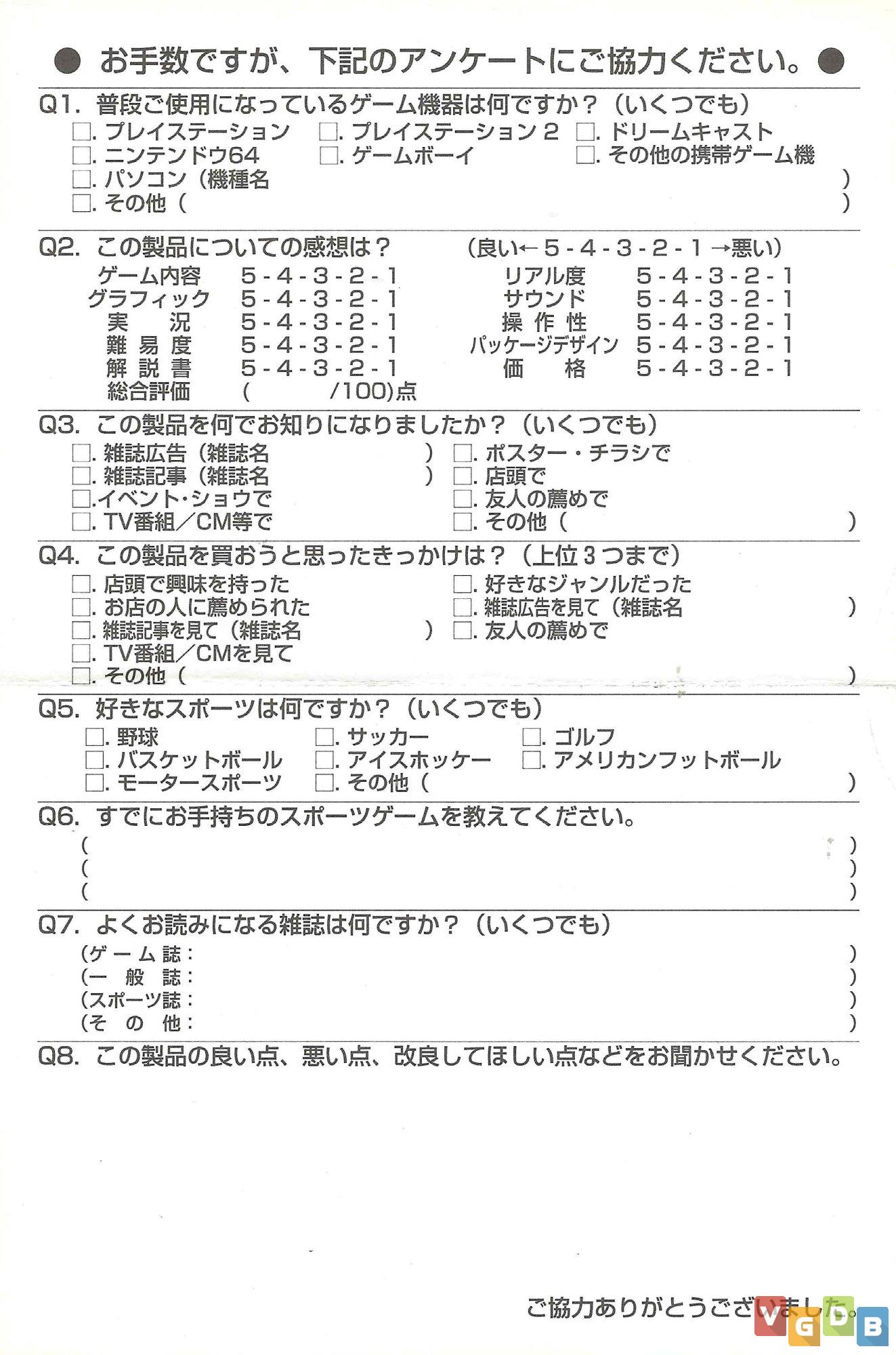 | Japão | 1 / 6 / 2000 | SLPS-02758 | 4938833005229 / 4938833005229 |