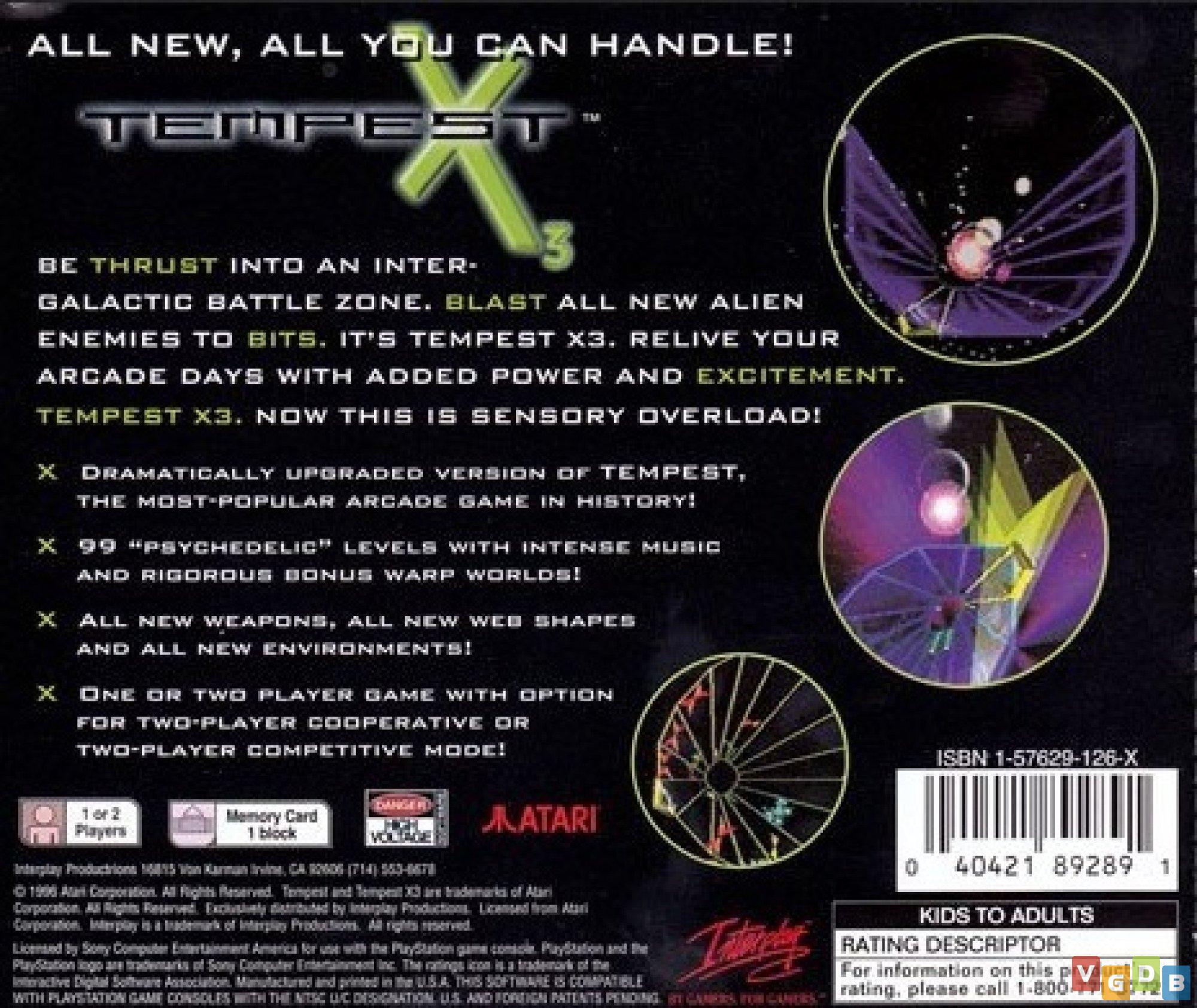 Jogo de tiro (shmup com visão superior), desenvolvido pela High Voltage Software e publicado pela Interplay. Além do PlayStation, o game também foi lançado para Jaguar, Saturn e no microcomputador Macintosh e PC, bem como nas coletâneas Atari 50: The Anniversary Celebration (PlayStation 4 / PlayStation 5 / Switch / Xbox One / Xbox Series X|S / PC), Llamasoft: The Jeff Minter Story (PlayStation 4 / PlayStation 5 / Switch / Xbox One / Xbox Series X|S / PC) e Polymega Collection Vol. 12 - TEMPEST (Polymega).